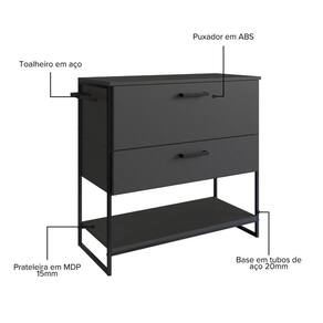 Com robusta estrutura em metal, oferece máxima organização com porta, gaveta, prateleira e um prático toalheiro lateral.