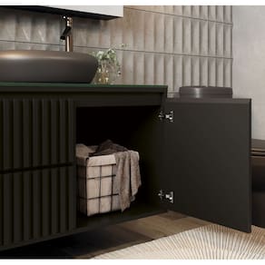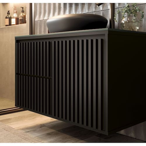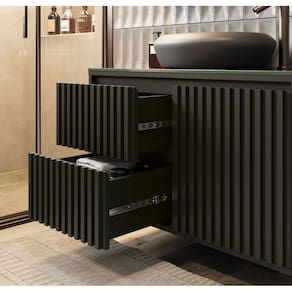 O Gabinete possui tampo de vidro de 8mm de espessura, que da beleza e maior resistência ao seu produto, puxadores em cava 45º, dando estilo e leveza ao ambiente, gavetas com corrediças telescópicas e sistema slow de fechamento suave, também possui divisórias internas que facilitam a organização de seu banheiro.