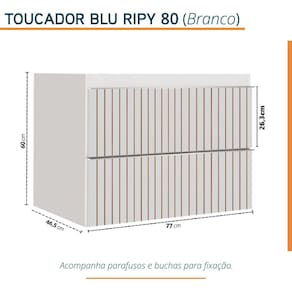 Produto fabricado em MDP PF (15mm), com ripas autênticas fabricadas em HDF BP (06mm), na largura de 20mm. Puxadores de alumínio anodizado; caixaria estruturada com cantoneiras metálicas; gavetas com corrediças telescópicas proporcionando abertura total das mesmas; gaveta com divisores e higiênico organizador dental (removível e lavável); e gaveta interna com manta anti-derrapante, protegendo o fundo da mesma. Acompanha parafusos buchas para fixação na parede. Possui manual de instalação. Ideal para compor com o Lavatório 80 da Marca BLU LAVATÓRIOS (vide site do Madeira Madeira). Produto sai montado de fábrica, devidamente regulado, bastando apenas fixá-lo na parede. Garantia de 12 meses para defeito de fabricação. Acabamento da Gaveta: BP Acompanha Cuba: Não Acompanha Manual de Instalação: Sim Acompanha Parafusos Para Fixação Na Parede: Sim Ambiente Principal: Banheiro codigo_ean: 7909903692516 Cor: Branco Cor do Produto: Branco Cor Interna: Branco Escala de Brilho: Acetinado Escala de Brilho da Gaveta: Semi-Fosco Furação para Cuba e Torneira: Não Gaveta com Chave: Não Informações Complementares: Produto sai montado de fábrica, devidamente regulado, bastando apenas fixá-lo na parede. Acompanha buchas de nylon + parafusos para fixação na parede. Itens Inclusos: 01 Gabinete Suspenso 80cm Linha ou Coleção: Coleção Ripy Manual de Montagem e Instalação: https://product-hub-prd.madeiramadeira.com.br/905926/documents/825cf6d0-2e0c-4c54-ae18-b6b2592729201932091348617151715901339.pdf Material da Gaveta: MDF/MDP Material do Puxador da Gaveta: Alumínio Material Principal: MDF/MDP Necessita Montagem: Não Origem do Produto: Nacional Peso: 27,3 kg Peso Máximo por Gaveta: 5 kg Possui Nichos: Não Possui Pés: Suspenso Possui Portas: Não Possui Prateleiras: Não Possui Recorte No Tampo Para Cuba: Não Possui Recorte No Tampo Para Misturador: Não Possui Sifão: Não Possui Tampo: Não Produto Montado: Sim Quantidade de Gavetas: 02 Recomendações de Uso, Manutenção e Limpeza: Nunca utilizar produtos químicos. Use somente flanela levemente umedecida em água e em seguida uma outra seca e macia. Caso ocorra vazamento ou acúmulo de água no produto, enxugar imediatamente. Resistente à Chuva: Não Sapatas Niveladoras: Não Suporta Até (kg): 10 kg Suporte para Toalheiro: Não Tamanho Indicado Para Cuba: 80 Tipo de Corrediça da Gaveta: Metálica Telescópica Tipo de Móvel para o Banheiro: Gabinete de Banheiro Tipo de Puxador da Gaveta: Externo Tipo do produto: Gabinete