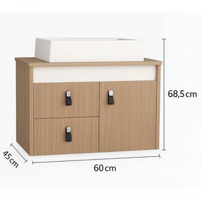 Características Gerais do Produto: - Altura: 68,5 cm - Garantia: Garantia de 3 meses - Largura: 60 cm - Madeira: MDF - MDP 15mm - Marca: Venturi - Material Estrutura: MDF - MDP 15mm - Material da Cuba: Cuba em Pedra Ardósia com Pintura PU - Montagem Necessária?: Não - Pedra: Pedra Ardósia - Peso: 35 kg - Profundidade: 45 cm - Tipo de Instalação: Suspenso (fixado na parede)