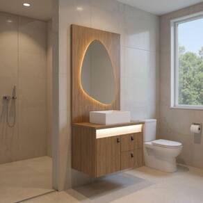 Design moderno e funcional Com acabamento em MDF/MDP de 15mm, o gabinete suspenso Tech Led 2G alia durabilidade e estilo, otimizando o espaço do banheiro.