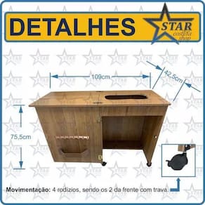 Com medidas de 42,5cm de largura, 75,5cm de altura e comprimento de 52cm quando fechado e 109cm quando aberto, esse gabinete oferece um espaço ideal para acomodar a máquina de costura Brother BM2800. Além disso, possui uma abertura específica de acordo com o modelo da máquina descrita neste anúncio.