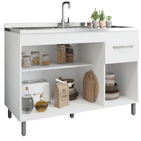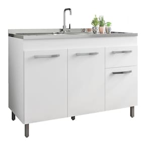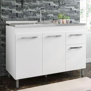 CARACTERÍSTICAS - Acabamento interno e externo em pintura UV - Dobradiças metálicas de pressão 26mm - Gaveta com corrediças metálicas - Pés em PVC com regulagem - Puxadores cromados