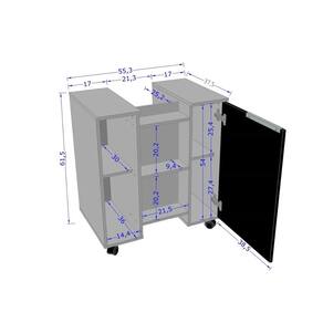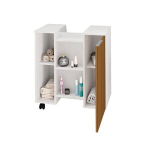 Conta com 1 porta com dobradiças metálicas, 6 nichos internos para melhor organização e 4 rodízios, que facilitam a locomoção sempre que necessário. Produzido em MDP de 12 mm, possui acabamento em verniz poliéster brilhante com secagem UV, impressão a laser e bordas protegidas com fita decorativa aplicada por sistema hot melting.