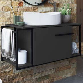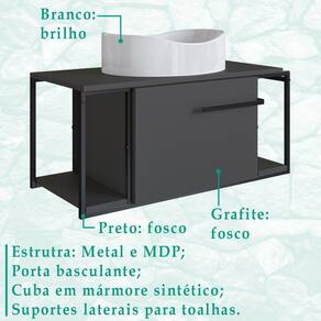 Gabinete Suspenso E Cuba De Mármore Sintético P1019X941012, móvel perfeito para completar ainda mais seu banheiro, conta com versatilidade e design conceitual. Possui estrutura em aço de 15mm, MDP de 15 mm e cuba em mármore sintético. Conta com porta basculante com braço articulado e dobradiça metálica, possui também puxador em aço e suportes laterais com prateleira para armazenamento de suas toalhas e demais itens, permitindo fácil acesso. É fixado na parede através de parafusos e buchas. Com design industrial e bom gosto, este conjunto acrescentará comodidade e beleza ao seu banheiro. Este móvel chegará na sua casa separado em 02 volumes.