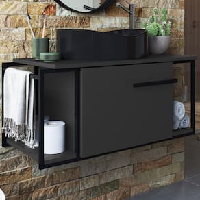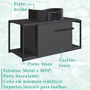 Gabinete Suspenso E Cuba De Mármore Sintético P1019X941012, móvel perfeito para completar ainda mais seu banheiro, conta com versatilidade e design conceitual. Possui estrutura em aço de 15mm, MDP de 15 mm e cuba em mármore sintético. Conta com porta basculante com braço articulado e dobradiça metálica, possui também puxador em aço e suportes laterais com prateleira para armazenamento de suas toalhas e demais itens, permitindo fácil acesso. É fixado na parede através de parafusos e buchas. Com design industrial e bom gosto, este conjunto acrescentará comodidade e beleza ao seu banheiro. Este móvel chegará na sua casa separado em 02 volumes.