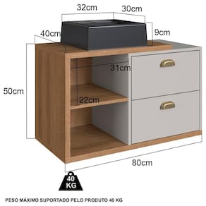 Características adicionais: Balcão com 2 gavetas, puxadores em formato de concha, 2 nichos externos, corrediças metálicas, cuba em mármore sintético