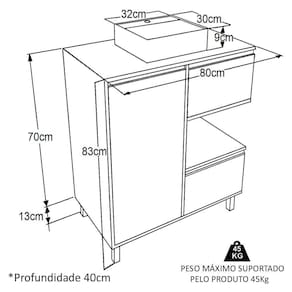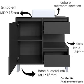 Características adicionais: acompanha 1 cuba em mármore sintético, 1 porta, 2 gavetas, 1 nicho externo, dobradiças e corrediças metálicas, pés em ABS reguláveis