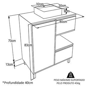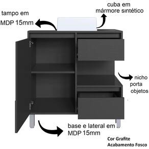 Características adicionais: acompanha 1 cuba em mármore sintético, 1 porta, 2 gavetas, 1 nicho externo, dobradiças e corrediças metálicas, pés em ABS reguláveis