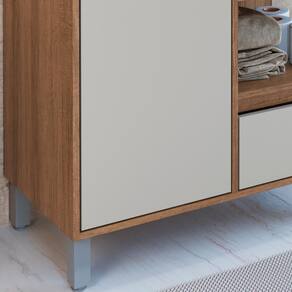 Características adicionais: acompanha 1 cuba em mármore sintético, 1 porta, 2 gavetas, 1 nicho externo, dobradiças e corrediças metálicas, pés em ABS reguláveis