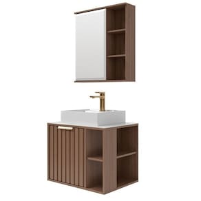 Conjunto para Banheiro com Gabinete e Espelheira Noruega é formado por Gabinete para Banheiro 100% MDF, Cuba em Marmore Sintético e Espelheira em MDF. Com amplo espaço interno, nichos laterais, seu design e características garantem melhor e maior durabilidade ao produto. Aproveite e adquira já o Conjunto Noruega para deixar o seu ambiente ainda mais charmoso, sofisticado e elegante. Altura do Conjunto: 62.6 cm Ambiente: Banheiro Ambiente Principal: Banheiro codigo_ean: 7900288265685 Cor: Freijó Cor do Produto: Freijó Informação Complementar: 1x Gabinete para Banheiro 60cm com 1 Porta 2 Nichos e Cuba de Sobrepor Noruega Freijó Largura: 61,3 cm Altura: 58,5 cm Peso: 22,8 kg Profundidade: 45,1 cm Necessita Montagem: Sim