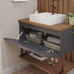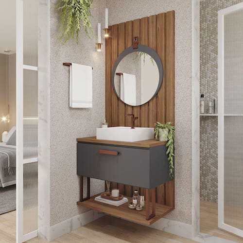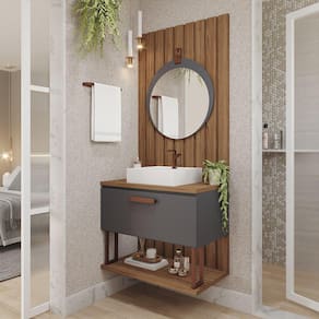 Características: Estrutura em MDF Acabamento em Pintura UV Puxador em cobre fosco 01 Porta com pistão à gás Dobradiças metálicas Acompanha cuba em mármore sintético Acompanha espelho com alça de couro
