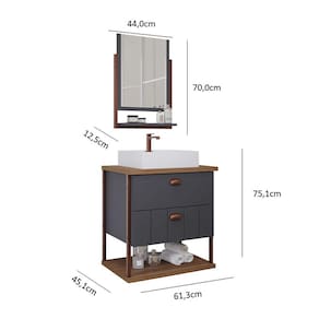Características: Estrutura em MDF Acabamento em Pintura UV Puxadores e alça em couro 02 Portas Dobradiças metálicas Acompanha cuba em mármore sintético Acompanha espelho