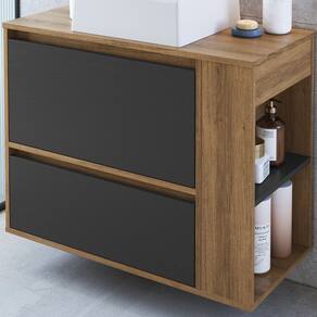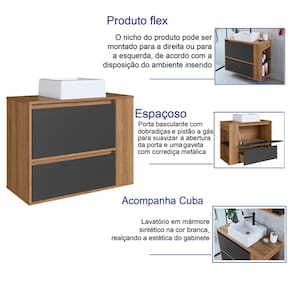 Características adicionais: cuba em mármore sintético, acabamento fosco, 2 nichos laterais, porta basculante com pistão metálico, 1 gaveta tipo gavetão e corrediças metálicas