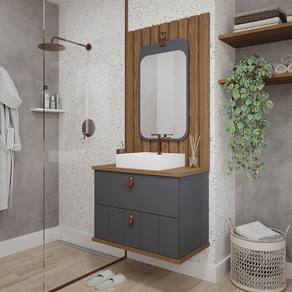 Características: Estrutura em MDF Acabamento em Pintura UV Puxadores e alça em couro 01 Porta com pistão à gás e dobradiças metálicas 01 Gaveta com corrediças telescópicas Acompanha cuba em mármore sintético Acompanha espelho Acompanha painel ripado