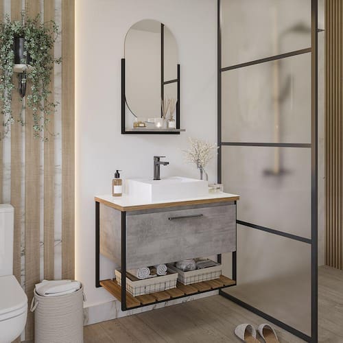 Características: Estrutura em MDF Acabamento em Pintura UV 01 Porta basculante com pistão à gás e dobradiças metálicas Puxador em alumínio preto fosco Suportes laterais em Metalon 20x20 com acabamento em pintura eletrostática preto fosco Sob o tampo vidro de 4mm temperado e pintado com acabamento perolizado Prateleira ripada Acompanha cuba em mármore sintético