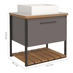 Características: Estrutura em MDF Acabamento em Pintura UV 01 Porta basculante com pistão à gás e dobradiças metálicas Puxador em alumínio preto fosco Suportes laterais em Metalon 20x20 com acabamento em pintura eletrostática preto fosco Sob o tampo vidro de 4mm temperado e pintado com acabamento perolizado Prateleira ripada Acompanha cuba em mármore sintético