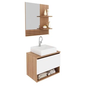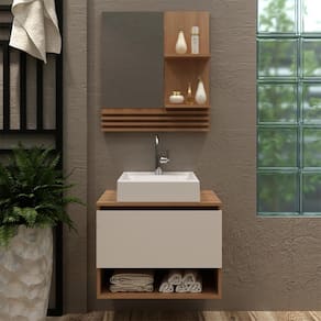 O Kit para Banheiro é a escolha ideal para transformar o seu espaço em um ambiente elegante e organizado. Com um design atual, ele oferece não apenas beleza, mas também funcionalidade, contribuindo para um banheiro agradável e útil. Produzido com materiais de alta qualidade, o kit garante durabilidade e resistência, criando um ambiente harmonioso e agradável para o seu dia a dia. CARACTERÍSTICAS TÉCNICAS: - Produzida em MDP de 15 mm - Acabamento UV na cor Branco e Amêndoa - Cuba em Mármore Sintético - Acompanha Espelho - Porta Basculante com Articulador e Dobradiças Metálicas - Puxador tipo Cava - Balcão Suspenso *Kit Composto por Gabinete Suspenso (3606), Espelheira (3614) e Cuba (3630) INFORMAÇÕES TÉCNICAS: 3606: Alt. 46,5 cm x Larg. 60 cm x Prof. 38,7 cm x P. 12 kg 3614: Alt. 44,7 cm x Larg. 60 cm x Prof. 38,7 cm x P. 12,65 kg 3630: Alt. 11,5 x Larg. 35 x Prof. 334 cm P. 5,5 kg INFORMAÇÕES ADICIONAIS: - ATENÇÃO: Não trabalhamos e não nos responsabilizamos pela montagem do móvel. Antes da montagem conferir se o produto está de acordo com o que comprou, produto montado e danificado pela montagem não será aceito troca. Montagem e instalação por conta do comprador. - As imagens ambientadas são meramente ilustrativas e podem apresentar itens que não compõe o produto. As cores do produto podem variar de acordo com o monitor, a iluminação do ambiente ou sua percepção visual. - Limpeza: Deve ser feita com pano macio e seco ou levemente. Não devem ser utilizados abrasivos como palha de aço e objetos cortantes. Garantia para defeitos de fabricação conforme Código de Defesa do Consumidor.