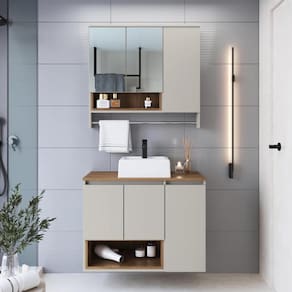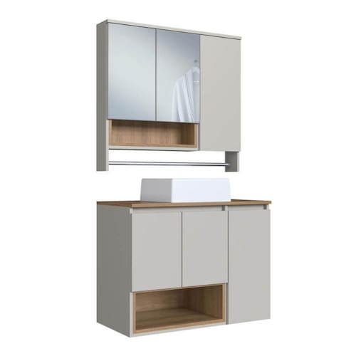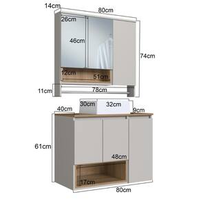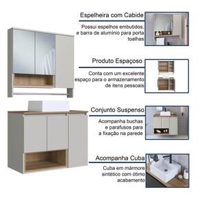 O conjunto para banheiro CJ9002 é produzido em MDP 15mm e acabamento FF fosco. O gabinete possui 1 prateleira interna que suporta 10 kgs, 3 portas com dobradiças metálica e 1 nicho que suporta até 10kgs. Estrututa do fundo em 3mm. A espelheira possui 3 prateleiras internas que suportam 2kgs cada, 3 portas de bater com dobradiça metálica, 2 espelhos de 3mm colados, 1 nicho que suporta 2kgs e 1 toalheiro em alumínio cromado. Produto suporta até 30kgs. Conteúdo da embalagem: móvel, ferragens e manual de montagem. Necessita fixação na parede e acompanha os parafusos para a fixação. A fixação das peças e/ou acessórios é feita por parafusos e cavilhas. Para uma limpeza mais efetiva, utilizar apenas pano macio umedecido e sabão neutro. Não utilizar produtos abrasivos. Garantia de 03 meses contra defeitos de fabricação. Medidas do produto gabinete (AxLxP): 61x80x40cm. Medidas do produto espelheira (AxLxP): 74x80x14cm. Peso total do produto: 41,45kgs. Produto acompanha cuba branca em mármore sintético. Marca: Não Informado