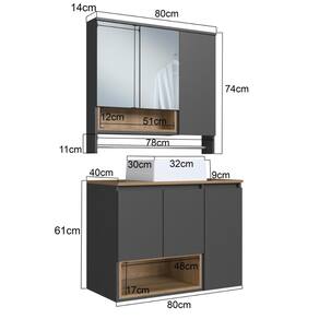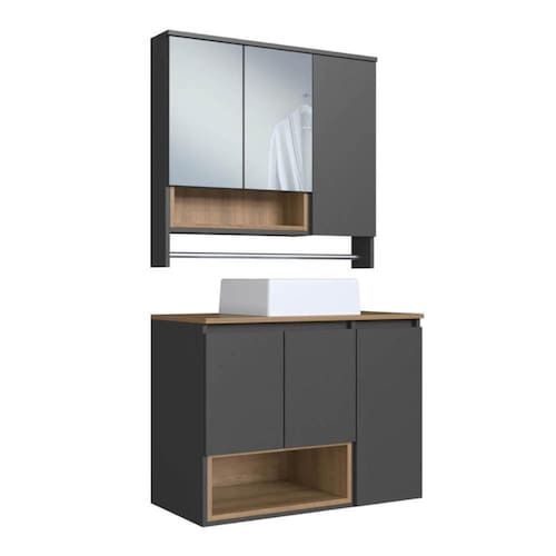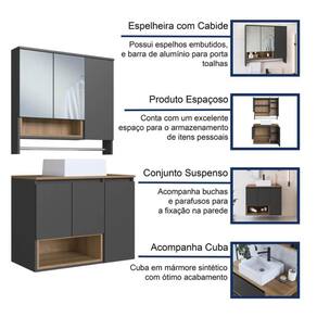 O conjunto para banheiro CJ9002 é produzido em MDP 15mm e acabamento FF fosco. O gabinete possui 1 prateleira interna que suporta 10 kgs, 3 portas com dobradiças metálica e 1 nicho que suporta até 10kgs. Estrututa do fundo em 3mm. A espelheira possui 3 prateleiras internas que suportam 2kgs cada, 3 portas de bater com dobradiça metálica, 2 espelhos de 3mm colados, 1 nicho que suporta 2kgs e 1 toalheiro em alumínio cromado. Produto suporta até 30kgs. Conteúdo da embalagem: móvel, ferragens e manual de montagem. Necessita fixação na parede e acompanha os parafusos para a fixação. A fixação das peças e/ou acessórios é feita por parafusos e cavilhas. Para uma limpeza mais efetiva, utilizar apenas pano macio umedecido e sabão neutro. Não utilizar produtos abrasivos. Garantia de 03 meses contra defeitos de fabricação. Medidas do produto gabinete (AxLxP): 61x80x40cm. Medidas do produto espelheira (AxLxP): 74x80x14cm. Peso total do produto: 41,45kgs. Produto acompanha cuba branca em mármore sintético. Marca: Não Informado