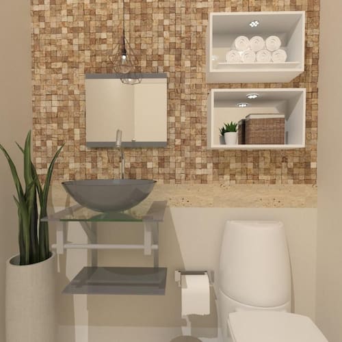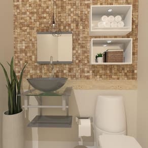 Dimensões: - bancada de vidro: 45 x 45 cm largura x profundidade - cuba de vidro: 35 cm diâmetro - prateleira bancada: 45 x 25 cm largura x profundidade - espelheira: 45 x 45 cm largura x altura - porta toalha: 45 cm largura - válvula