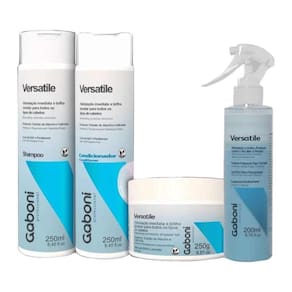 Gaboni kit versatile com 4 passos Hidrata imediata e brilho lamelar cabelos revitalizados e cheios de vida. Kit composto por: Shampoo versatile 250 ml Condicionador versatile 250 ml Máscara versatile 250 g Leave-in versatile 200 ml Shampoo hidratação imediata e brilho lamelar Contém: pantenol / extratos de hortelã, alecrim, hamamélis, calêndula, camomila e malva / óleo de babaçu / de murumuru / proteína do trigo. Rendimento aproximado: 15 aplicações Ph: 5,0 a 6,0 Cabelos saudáveis, revitalizados e cheios de vida. Limpa suavemente os fios, promovendo maciez e hidratação. Com ativos de alta performance, para uso diário, garante brilho e uma agradável sensação de limpeza duradora. Sua fórmula emoliente e tonificante, mantém a umidade natural dos fios sem provocar oleosidade, hidratando, condicionando e renovando o brilho natural dos cabelos. Modo de usar: aplique sobre os cabelos molhados e massageie até obter uma espuma rica e cremosa. Enxágue até a retirada completa do produto e repita a operação. Livre de sal cloreto de sódio e parabenos. Condicionador hidratação imediata e brilho lamelar Contém: pantenol / extratos de hortelã, alecrim, hamamélis, calêndula, camomila e malva / óleo de babaçu / de murumuru / proteína do trigo. Rendimento aproximado: 15 aplicações Ph: 5,0 a 6,0 Sua fórmula enriquecida com pantenol, extrato de alecrim e calêndula é o segredo para manter os fios hidratados, desembaraçados e com brilho radiante, diariamente. Esses ativos poderosos atuam como um hidratante de longa duração, com ação reparadora e protetora, revitalizando o fio da raiz às pontas e evitando a formação de pontas duplas, sem deixar um filme pesado sobre os cabelos. Modo de usar: aplique o condicionador versatile nos cabelos limpos, começando pelas pontas. Faça uma massagem suave até que os fios fiquem macios. Deixe agir por alguns minutos e enxágue abundantemente. Máscara hidratação imediata e brilho lamelar Rendimento aproximado: 22 aplicações Ph: 3,5 a 4,5 É uma poderosa máscara de hidratação multibenefícios, a solução perfeita para quem deseja restaurar os fios danificados, proporcionando brilho, maciez e hidratação profunda. Resultando em cabelos muito mais fortes e resistentes às agressões externas, com uma aparência saudável, brilhante e cheia de vida. Modo de usar: aplique sobre os cabelos limpos e úmidos, distribuindo o produto, mecha a mecha. Deixe agir por 5 a 10 minutos, com ou sem fonte de calor. Enxágue a seguir. Leave-in conditioner versatile Proteção contra o sol, mar e piscina. O leave-in coditioner versatile é hidratante e desembaraçante, que minimiza a formação de pontas duplas e o rompimento do fio. Contém ativos termoprotetores para escova ou chapinha e filtro solar específico para os cabelos. Fórmula elaborada com pantenol, que nutre profundamente os fios revitalizando e dando vida aos cabelos. Enriquecido com proteína do trigo, que protege os fios, é altamente condicionante e proporciona brilho intenso. Contém extrato de chá verde, que tem propriedades antienvelhecimento, adstringente, refrescante, purificante e antioxidante. Contém filtro solar e protetor térmico. Modo de uso: agite bem antes de usar. Vaporize o leave-in conditioner versatile sobre o cabelo limpo e úmido começando pelas pontas até a parte superior do cabelo. Excelente para ser utilizado durante o corte de cabelo, depois penteie e proceda a escova. Benefícios: 1- para todos os tipos de cabelos; 2- hidratação e brilho, sem pesar; 3- termoproteção e filtro solar; 4- protege contra o sol, vento, mar e piscina; 5- previne pontas duplas; 6- reduz a quebra; 7- nutre e revitaliza os fios; 8- adstringente, refrescante e purificante; 9- antioxidante, prolonga a durabilidade da coloração. 10- antienvelhecimento dos fios.