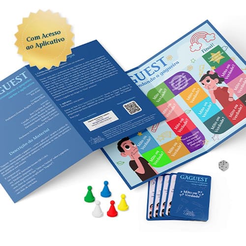 O Gaguest propõe a prática de atividades a serem realizadas entre crianças e adultos que convivem com pessoas que gaguejam. Código 0113 – Gaguest desvendando a gagueira – cartas e aplicativo: contém um Manual de Instruções (acesso QR Code); um Tabuleiro (impresso); 50 cartas impressas do tipo “Mito ou Verdade” sobre a gagueira; uma chave de acesso ao aplicativo “Gaguest”; cinco peões coloridos; um dado de seis lados.