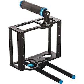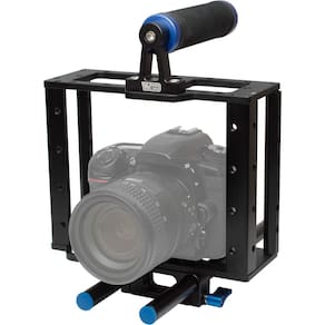 O design universal da gaiola de câmera universal de alumínio Vidpro Modelo CA-L pode acomodar praticamente qualquer câmera DSLR, protegendo e estabilizando o corpo da câmera sem bloquear o acesso às portas e controles. Sua construção usinada em CNC de precisão, toda em metal, é sólida e confiável. O compartimento da câmera é montado em tripés, monopés, bonecos e controles deslizantes usando soquetes de 1/4 polegada-20 ou 3/8 polegadas. Seus vários pontos de montagem com rosca de 1/4 polegada e 20 suportam luzes, microfones, monitores e outros acessórios. Os recursos adicionais incluem hastes duplas de 15 mm para montar uma unidade de foco contínuo ou caixa fosca e uma alça superior ergonômica (reversível) com uma alça emborrachada antiderrapante.