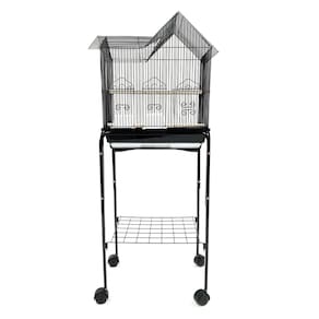 Gaiola para pássaros no topo de uma vila pequena com espaçamento de barra de 3/8" em preto. Ele vem com porta elevatória, 2 portas de alimentação, 2 xícaras e 2 poleiros, caixa de metal removível e bandeja plástica inferior deslizante. A dimensão da gaiola é 16L"x12D"x20H”. Com suporte de 18 x 18,
