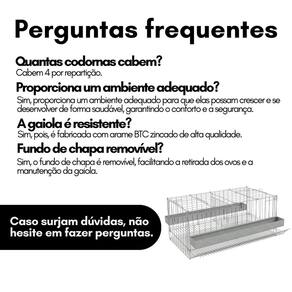 A Gaiola Poedeira para Codorna Desmontável com Divisão é a solução ideal para quem deseja criar codornas em um ambiente seguro e confortável. Com arame BTC zincado de alta qualidade e um fundo de chapa removível, essa gaiola garante a durabilidade e a praticidade necessárias para o seu negócio. Além disso, a Gaiola Poedeira para Codorna Desmontável com Divisão conta com uma série de recursos que a tornam ainda mais conveniente. Com bebedouro e comedouro inclusos, duas portas na parte superior para facilitar a manutenção e uma leve inclinação para coletar os ovos, essa gaiola é uma excelente escolha para criadores que buscam eficiência e praticidade. Comprimento: 46 cm Altura: 20 cm Largura: 24,5 cm Marca: Não Informado