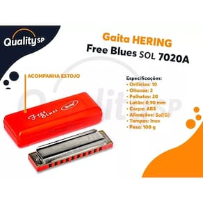 Gaita Free Blues em Dó 10 furos Diatônico Hering 7020G. A Gaita Diatônica Hering Free Blues 7020G possui corpo em ABS vermelho, chapa de vozes com 0,90 mm de espessura, e afinação em Sol (G). As gaitas Hering oferecem ótima qualidade, construção, facilitando a manutenção e aumentando a vida útil da harmônica, e também um custo beneficio excelente.