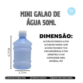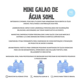 Mini Galão de Água 50ml O Mini Galão de Água 50ml é um produto extremamente versátil e prático, ideal para diversas finalidades. É muito utilizado para armazenar álcool gel, sendo perfeito para distribuição em eventos religiosos, como batizados, crismas e casamentos. Também é uma excelente opção para acompanha promocionais, campanhas de marketing e eventos corporativos, agregando valor e cuidado aos presentes. Este mini galão é ideal para o armazenamento de óleos essenciais e água benta, permitindo que os usuários tenham sempre à mão uma pequena porção de itens essenciais para o dia a dia ou práticas religiosas. Contém: 50 unidades completa Galão + Tampa Especificações do Galão: Altura do frasco: 6,7 cm Altura da tampa: 1,1 cm Altura com tampa fechada: 7 cm Circunferência: 11,7 cm Diâmetro: 3,7 cm Capacidade: 50 ml Na EMBANET, nossos produtos são fabricados com materiais de alta performance, durabilidade e ótimo acabamento. Todos os nossos itens são não tóxicos e ecologicamente corretos, proporcionando um excelente custo-benefício para nossos clientes. A qualidade e a satisfação dos nossos clientes são nossas prioridades. Marca: Não Informado Ean: 7794389970186