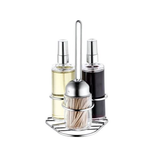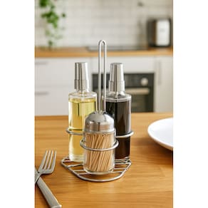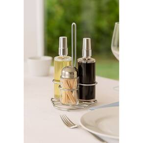 Composição do produto: 2 Recipientes em vidro para azeite e vinagre com válvula spray 100mL 1 Recipiente em vidro para palitos com tampa em inox 1 Suporte em aramado cromado