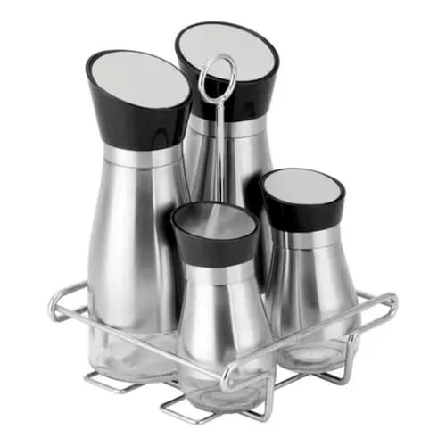 Este modelo de Galheteiro é feito com acabamento externo de Aço inox de alta qualidade e resistência, material que não oxida e nem enferruja com o passar do tempo. Os recipientes dos condimentos e temperos são fabricados em vidro transparente, ideal para visualização dos seus temperos.