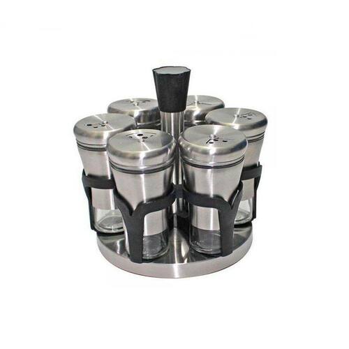 Galheteiro Suporte Porta Condimentos 6 Peças Inox Porta temperos giratório com 6 potes em inox. Item essencial para manter seus temperos organizados e deixando a decoração da sua cozinha mais bonita, trazendo praticidade e beleza Especificações do produto: - material: inox - potes: 6 - giratório: sim - dimensões: - altura: 18 cm - profundidade: 19,5 cm - largura: 19,5 cm