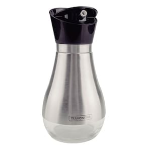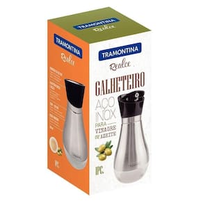 INFORMAÇÕES GERAIS DO GALHETEIRO TRAMONTINA EM VIDRO E AÇO INOX - Altamente durável, mantém as características , preservando a beleza, a higiene e a durabilidade do material. - Design moderno. - Beleza e praticidade em seu design. Ideal para ir à mesa. - Tampa giratória em polipropileno, com bico dosador e sistema corta-gotas. - Recipiente em vidro revestido em aço inox. - Capacidade: 390ml