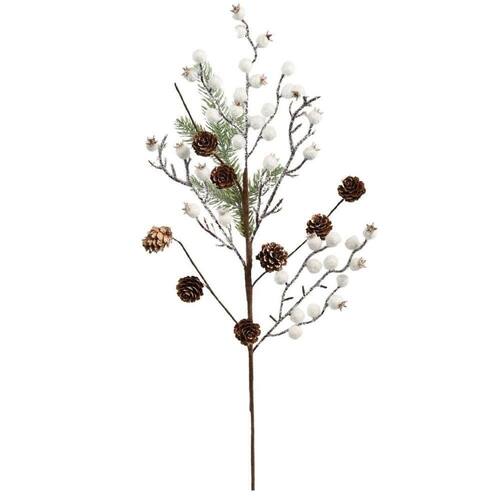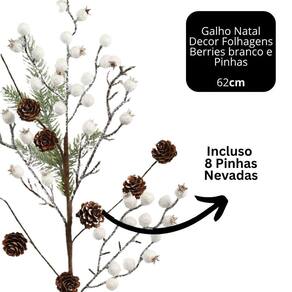 Galho Decorativo Natalino Nevado Rústico com Berries Brancas e 8 Mini Pinhas 62cm
