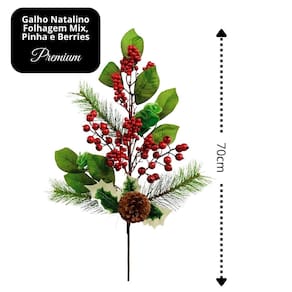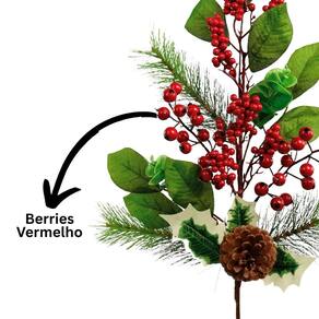 O design é enriquecido com berries vermelhos vibrantes e pinha natural, compondo uma peça charmosa e versátil para arranjos, guirlandas, centros de mesa ou para complementar a decoração da árvore de Natal.
