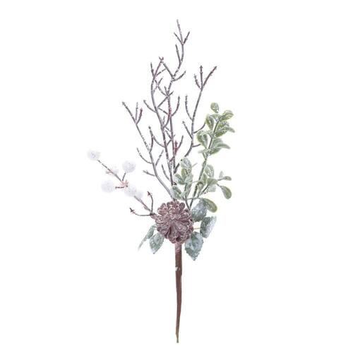 Galho nevado com folhas verdes e frutas brancas 38cm - Embalagem de Venda: 1 UN - Cor Predominante: BRANCO / VERDE - Material Utilizado: 55% Plástico, 30% Isopor, 10% Metal e 5% Papel Instruções de Limpeza: Limpar com pano macio, seco ou espanador Ref: Cromus: 1113217