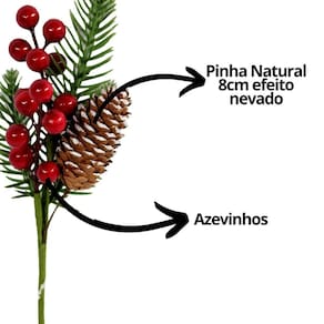 Detalhes: Pinha natural 8cm com efeito neve e azevinhos vermelhos