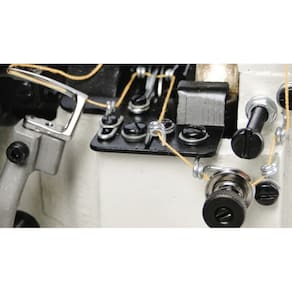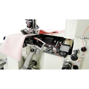 Máquina de costura tipo galoneira. Aplicação para bainha, debrum (colarete) e rebatimento de elástico.