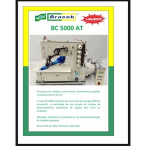 A nova Bracob BC5000AT ganha em economia de energia (63% de economia) e praticidade de uso atraves do sistema de posicionamneto automático de agulha (em cima ou ebaixo) Alteração eletrônica via parâmetros da velocidade/rotação de trabalho desejada . Baixo nível de ruídos durante a operação .