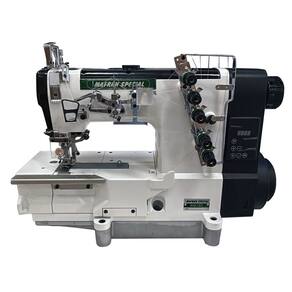 Motor Direct-Drive diretamente acoplado ao eixo da máquina; Economia de energia mínima de 60%.; Posicionador de agulha em cima/embaixo; Base plana Fechada; Trançador superior (removível) e inferior; 3 agulhas, 5 fios. Distância entre primeira e última agulha de 6.4mm (1/4"); Comprimento do Ponto de 1,2 a 4mm; Lubrificação automática por bomba de óleo; Velocidade de costura de até 6000 ppm, ajustável pela caixa de controle; Visor do nível do óleo. - Rotação máxima = 6000 RPM - Motor Direct drive (motor acoplado internamente na máquina) - Coração Externo ( mais fácil pra passar as Linhas)