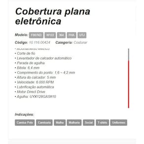 Descrição Máquina escada com 2 ou 3 agulhas, base plana , com entrelaçamento inferior e superior, 6000 pontos/min, lubrificação central. Servo motor embutido no cabeçote da máquina .