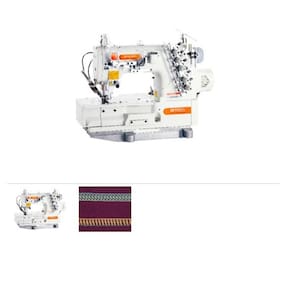 Espaçamento disponível para agulhas duplas: 4,0; 4,8 mm (opcional), para três agulhas: 5,6 mm e 6,4 mm, possibilidade de desligar o entrelaçamento superior , equipado de série com régua de bainha. Além disso, pode ser equipado com transfer para costuras overloque, bainhas, costura em elásticos, etc.