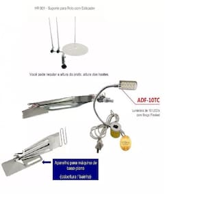 Descrição da máquina + Acompanha 1 kit de acessórios: 1 - Aparelho de viés 1 - Luminária de LED com haste flexível 1- Aparelho Elástico Mexicano 1- Suporte de Rolos Máquina de costura tipo galoneira. Aplicação para bainha, debrum (colarete) e rebatimento de elástico. DETALHES TÉCNICOS: 2 agulhas; 3 fios; Largura da costura = 6,35mm; Altura calcador = 6,0mm; Tipo de Agulha DVx63; Comprimento máximo do ponto = 4mm; Lubrificação manual com buchas auto-lubrificantes a base de grafite e eixo central acoplado em 2 rolamentos; Buchas da barra de agulha em bronze sinterizado; Rotação máxima = 2000 RPM; Motor = 7000 – 9000RPM; Potência 400w Motor acoplado à máquina; A MONTAGEM É FEITA POR CONTA DO COMRPADOR !