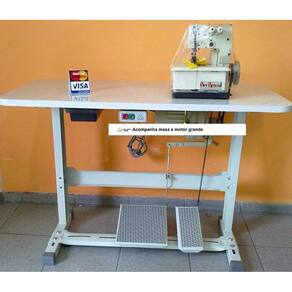 Máquina de costura galoneira 3 fios completa com mesa e motor. Utilizada para barras, bainhas, debrum e rebatimento de elástico em tecidos leves e médios.