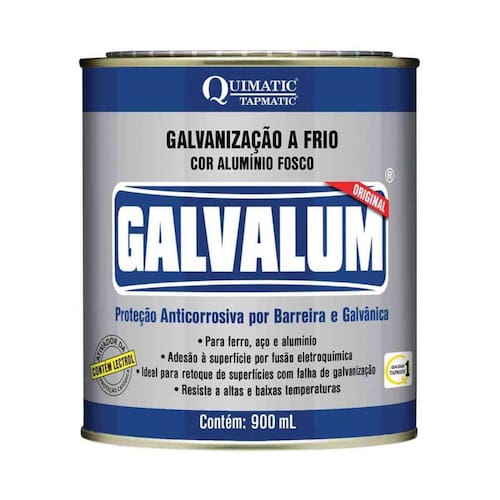 GALVALUM Galvanizador a frio 900ml Quimatic Tapmatic Descriçao do Produto Galvalum é um revestimento para galvanização à frio, possui uma combinação de zinco, metais galvânicos,alumínio e resinas selecionadascom excepcional propriedade anticorrosiva mais de 1000 horas de resistência em câmara de névoa salina Ideal para reparos em superfícies galvanizadas danificadas ou submetidas a processo de solda. Indicado para todas as superfícies que requerem proteção anticorrosiva excepcional. Cor de alumínio fosco, moderno e elegante. Ideal para estruturas metálicas, portões, cercas, janelas, silos, torres, pontes, suportes, telhados, tubos e peças metálicas, etc. Resiste à urina. Galvalum adere ao ferro, aço ou alumínio através de ação por fusão eletroquímica intensificada pelo Lectrol, que ativa a proteção catódica contra a ferrugem; Seu conteúdo metálico galvânico torna-se um ânodo e a superfície revestida um cátodo: assim, a atração das polaridades inversas assegura a deste produto na microporosidade de toda superfície metálica, impedindo o alastramento da ferrugem por baixo desta camada de proteção; Além da proteção galvânica, fornece também proteção anticorrosiva por barreira. Marca: Não Informado