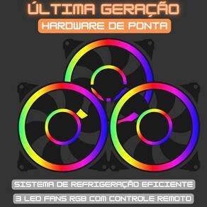 Gabinete com Refrigeração RGB: O design moderno com lateral em vidro temperado e 3 fans com iluminação RGB (com controle remoto) não só garante a refrigeração, mas também um visual incrível para o seu setup.