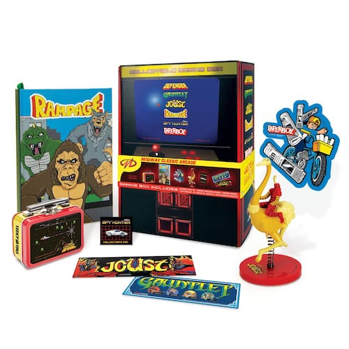 - Cada caixa inclui: Diário Rampage, defender teeny Twin, adesivo Joust bumpers, adesivo defender bumpers, folha magnética de papel menino, boneco de vinil Joust Bungler e broche de lapela Spy Hunter